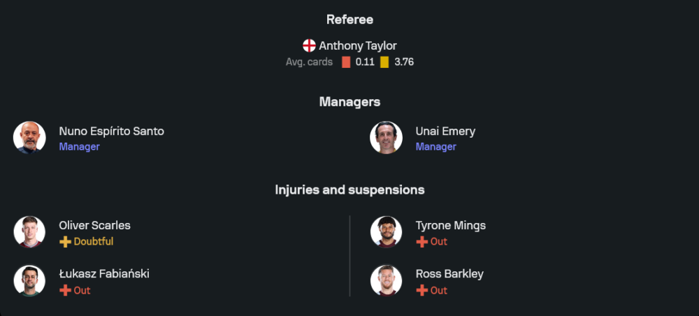 แผน 3-4-2-1 ใช้ อัลฟอนเซ่ อาเรโอล่า เฝ้าเสา สามปราการหลังประกอบด้วย มาฟโรปานอส, โตดิโบ้ และ คิลแมน ซึ่งต้องเล่นให้แน่นกว่าที่เคยหลังโดนยิงกระจุยในบ้านหลายเกมก่อนหน้านี้ คู่กลางใช้ กีโด้ โรดริเกวซ ยืนคุมเกมร่วมกับ ปาเกต้า วิงแบ็กขวาเป็น วาน-บิสซาก้า ที่เติมเกมบุกเก่ง ส่วนฝั่งซ้ายใช้ ดิยุฟ คอยวิ่งขึ้นลงไม่มีหยุด แถวสองมี มาเตอุส แฟร์นานเดส กับ โบเว่น รับบทสร้างสรรค์เกมรุกให้ วิลสัน หัวหอกตัวเป้า ที่พร้อมใช้ประสบการณ์จัดการแนวรับวิลล่า