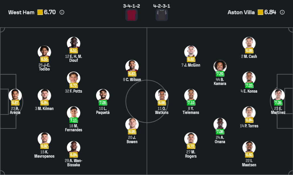 ภาพจากไลน์อัปล่าสุดของ Sofascore บอกชัด เวสต์แฮมภายใต้การคุมทัพของ นูโน่ เอสปิริโต้ ซานโต ยืนระบบ 3-4-1-2 ใช้ อัลฟอนเซ่ อาเรโอล่า ยืนเฝ้าเสา แผงหลังจัด คอนสแตนตินอส มาฟโรปานอส, ฌ็อง-แคลร์ โตดิโบ้ และ แม็กซิมิเลี่ยน คิลแมน กลางสนามมี อารอน วาน-บิสซาก้า กับ เอล ฮาฌี่ มาลิค ดิยุฟ วิ่งริมเส้น ขณะที่ใจกลางฝากไว้กับ มาเตอุส แฟร์นานเดส และ ลูคัส ปาเกต้า ส่วนด้านหน้า จาร์ร็อด โบเว่น เล่นคู่กับ คัลลั่ม วิลสัน คอยกดดันหลังวิลล่าไม่ให้ตั้งลำง่ายๆ