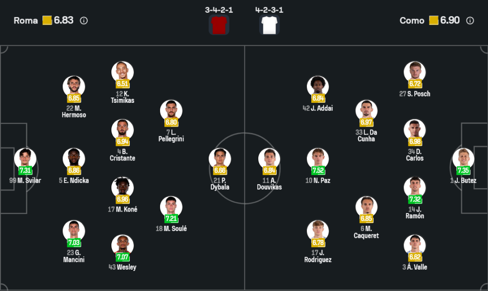 จากข้อมูลภาพ 11 ตัวจริงที่คาด โรม่าอาจใช้ ไมล์ สวิลาร์ เฝ้าเสา แผงหลังวาง มาริโอ เอร์โมโซ่ กับ จานลูก้า มันชินี่ และแนวรับอีกหนึ่งคนช่วยปิดพื้นที่ ริมเส้นมี เวสลีย์ กับ คอสตาส ซิมิกาส ทำหน้าที่เป็นวิงแบ็ก เติมเกมขึ้นลงไม่หยุด แดนกลางคุมจังหวะด้วย มานู โคเน่ และ ไบรอัน คริสตันเต้ ส่วนสองตัวรุกหลังหน้าเป้าเป็น มาติอัส ซูเล่ กับ ลอเรนโซ่ เปลเลกรินี่ คอยปั้นเกม โดยมี เปาโล ดีบาล่า เป็นตัวทำเกมและจบสกอร์ได้ในตัวเอง จุดสำคัญคือโรม่าอาจไม่ได้ชนะด้วยการเปิดหน้าแลกแบบบ้าคลั่ง แต่จะชนะด้วยการคุมจังหวะแล้วแทงทีเดียวให้ขาด
