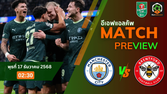 ค่ำคืนวันพฤหัสบดีที่ 18 ธันวาคม 2568 เวลา 02.30 น. แฟนบอลห้ามหลับเมื่อศึก อีเอฟแอลคัพ รอบลึกกำลังระเบิดความมันส์ที่ เอติฮัด สเตเดี้ยม เจ้าถิ่นยักษ์ใหญ่จากเมืองแมนเชสเตอร์อย่าง แมนเชสเตอร์ ซิตี้ เปิดบ้านรับการมาเยือนของทีมจอมกัดจากลอนดอน เบรนท์ฟอร์ด เกมนี้ไม่ได้มีแค่ตั๋วเข้ารอบเป็นเดิมพัน แต่คือศักดิ์ศรีทีมพรีเมียร์ลีกที่พร้อมวิ่งชนกันแบบไม่เกรงหน้าไหน