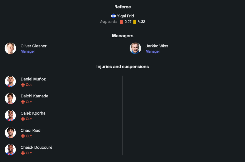 ฝั่งเจ้าบ้านของกุนซือโอลิเวอร์ กลาสเนอร์ ยังคงต้องจัดทัพภายใต้ปัญหาตัวเจ็บหลายราย ดาอิชิ คามาดะ มิดฟิลด์เชื่อมเกมคนสำคัญมีอาการเจ็บแฮมสตริงจากเกมลีกกับแมนเชสเตอร์ ซิตี และยังไม่พร้อมคืนสนาม เช่นเดียวกับแบ็กขวาตัวทำเกมอย่าง ดาเนียล มูญอซ ที่ขึ้นเขียงผ่าหัวเข่าไปก่อนหน้านี้ นอกจากนี้ยังมี เช็ค ดูกูเร่, ชาดี ริยาด, เคเล็บ คปอร์ฮา และดาวรุ่ง ริโอ คาร์ไดน์ส ที่ยังต้องพักยาว