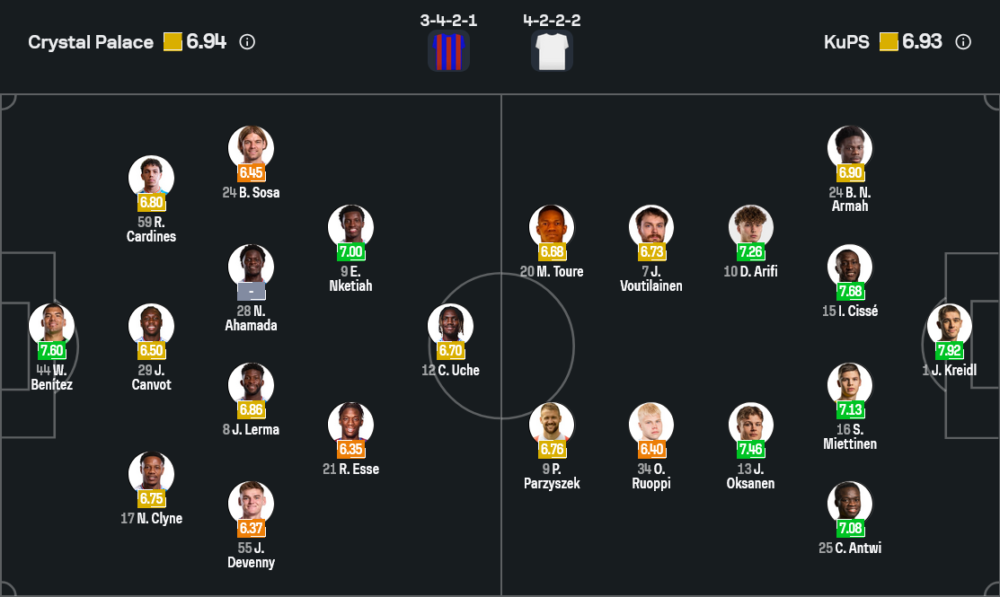 ฝั่งทีมเยือนของกุนซือ ยาร์คโค วิสส์ เน้นส่งชุดใหญ่เต็มอัตราศึก เพราะนี่คือเกมที่อาจเป็นนัดสุดท้ายของฤดูกาลยุโรป ผู้รักษาประตู โยฮันเนส เครย์ดิล ยืนเป็นด่านสุดท้าย แผงหลังสี่คนใช้ บ็อบ เอ็น. อาร์มาห์ ประจำการด้านขวา คู่เซ็นเตอร์เป็น อิบราฮิม ซิสเซ จับคู่กับ ซามูลี มิเย็ตตินเนน ส่วนฝั่งซ้ายมี คาลวิน แอนต์วี เติมเกมทั้งรุกและรับในระบบ 4-2-2-2 หรือสามารถปรับเป็น 4-2-3-1 ได้ระหว่างเกม