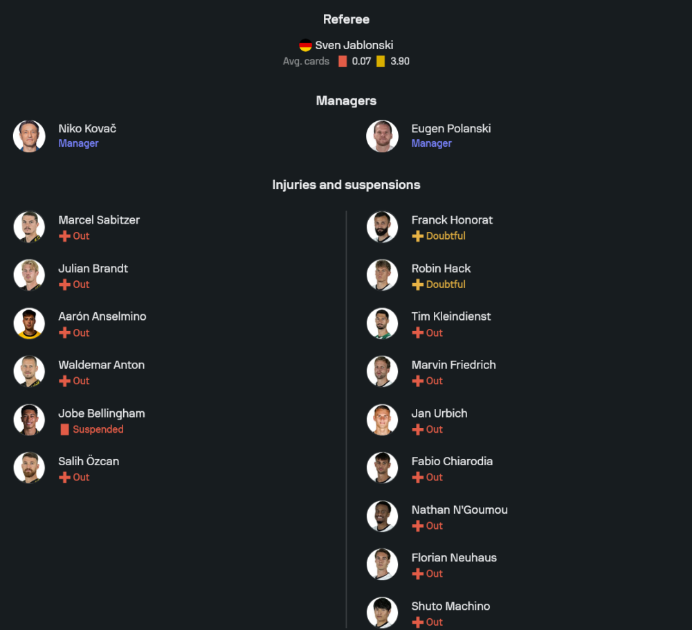 ลูกทีมของ นิโก โควัช เพิ่งสะดุดเสมอไฟรบวร์กคาบ้าน ทำให้สองนัดหลังในทุกรายการยังไม่รู้จักคำว่าชนะ สภาพทีมก่อนเกมนี้ไม่ได้สมบูรณ์นัก เมื่อจากข้อมูลล่าสุดจะขาดแข้งสำคัญหลายราย แน่นอนว่า โจ้บ เบลลิงแฮม โดนโทษแบนจากใบแดงโดยตรง ขณะที่รายชื่อเดี้ยงยาวมีทั้ง มาร์เซล ซาบิตเซอร์, ยูเลียน บรันด์ท, อารอน อันเซลมิโน, วัลเดมาร์ อันตัน และ ซาลิห์ ออซชาน ทำให้ตัวเลือกในแดนกลางและแนวรับหายไปเยอะ