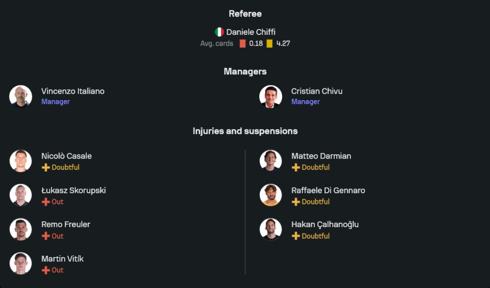 ฝั่งโบโลญญ่าของอิตาเลียโน่ สภาพทีมไม่ได้สมบูรณ์ร้อยเปอร์เซ็นต์แต่ภาพรวมยังพอลุยได้สบาย จากข้อมูลล่าสุดพวกเขาจะไม่มี ลูคัสซ์ สโกรุปสกี้, มาร์ติน วิติก, นิโคโล คาซาเล่ และ เรโม ฟรอยเลอร์ ที่บาดเจ็บอยู่ก่อนแล้ว อย่างไรก็ตามข่าวดีคือ ทอร์บยอร์น เฮกเกม กองหลังที่โดนใบแดงในลีกนัดล่าสุดไม่ติดโทษแบนในฟุตบอลถ้วย ทำให้ลงสนามได้