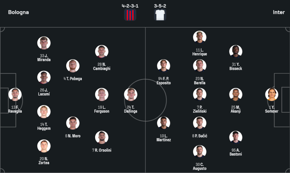 ระบบที่ใช้ตามถนัดคือ 3-5-2 ตามแผนจาก Sofascore ผู้รักษาประตูเป็น ยานน์ ซอมเมอร์ กองหลังสามคนเรียงจากขวาไปซ้าย ยานน์ บิสเซ็ค, มานูเอล อาคานยี และ อเลสซานโดร บาสโตนี วิงแบ็กซ้ายใช้ คาร์ลอส ออกุสโต เติมเกมลึก ขณะที่ฝั่งขวาให้โอกาส ลุยส์ เอนริเก้ ทำหน้าที่ลากเลื้อยริมเส้น กลางสามคนมี นิโคโล บาเรลลา ที่เป็นหัวใจสำคัญในเชิงเพรสซิ่งและเชื่อมเกม ร่วมกับ ปิโอตอร์ ซิลินสกี และ เปตาร์ ซูชิช คอยขับจังหวะรุก ส่วนคู่กองหน้าจัด ฟรานเชสโก ปิโอ เอสโปซิโต้ ดาวรุ่งที่แฟน ๆ จับตา ให้ยืนเคียงข้างกัปตันทีม เลาตาโร มาร์ติเนซ ที่พร้อมกระหน่ำตาข่ายได้ทุกจังหวะ
