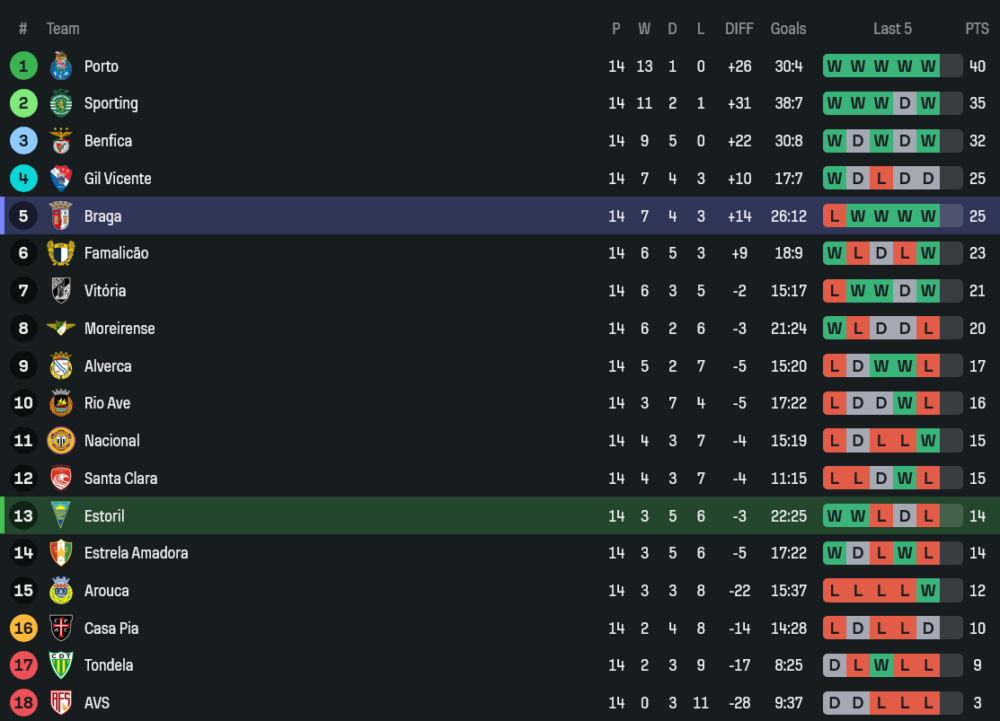 อย่างไรก็ดี หากดูเฉพาะผลงานในบ้าน พวกเขายังพอเหนียวแน่น แข่ง 7 นัด ชนะ 2 เสมอ 3 แพ้ 2 ยิงได้ 12 และเสีย 11 ตัวเลขบอกว่าถ้าเล่นกันด้วยสมาธิและตัดความผิดพลาดส่วนบุคคลออกไป เอสโตริลสามารถยื้อแต้มจากทีมใหญ่ได้เหมือนกัน