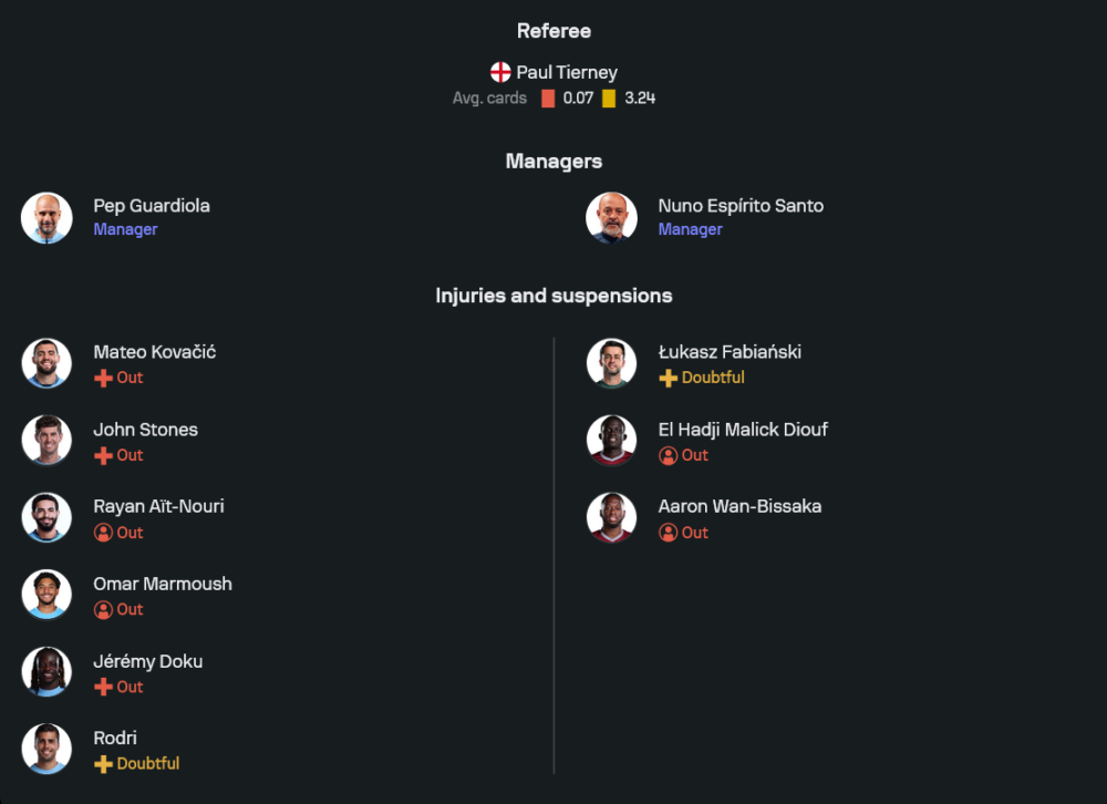เจ้าบ้านของ เป๊ป กวาร์ดิโอลา ยังคงมีลิสต์ตัวเจ็บพอสมควร ทั้ง มาเตโอ โควาชิช, จอห์น สโตนส์, รายาน ไอต์ นูรี, โอมาร์ มาร์มูช, เฌเรมี โดกู รวมถึงดาวรุ่ง ออสการ์ บ็อบบ์ ขณะที่ โรดรี ยังถูกประเมินอาการแบบวันต่อวัน หากไม่ฟิตเต็มร้อยมีสิทธิ์เริ่มที่ม้านั่งสำรอง อย่างไรก็ดี ขุมกำลังที่เหลือยังแน่นและหมุนเวียนได้ตามสไตล์เรือใบ
