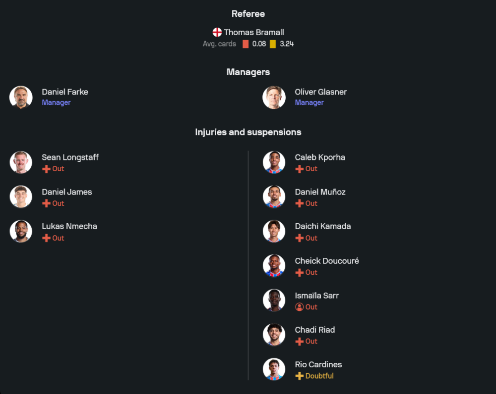 อย่างไรก็ดี พาเลซมีปัญหาตัวเจ็บไม่น้อย ไล่ตั้งแต่ ไดอิจิ คามาดะ, ดาเนียล มูนญอซ, เชก ดูกูเร, ชาดี ริยาด, เคเล็บ คปอร์ฮา รวมถึง ริโอ การ์ดินส์ ที่ยังต้องเช็กฟิต ขณะที่ อิสไมลา ซาร์ ต้องเดินทางไปรับใช้ทีมชาติเซเนกัลในศึกแอฟริกัน เนชั่นส์ คัพ ทำให้การหมุนเวียนตัวผู้เล่นในช่วงโปรแกรมถี่ๆ เป็นโจทย์ใหญ่ของกลาสเนอร์