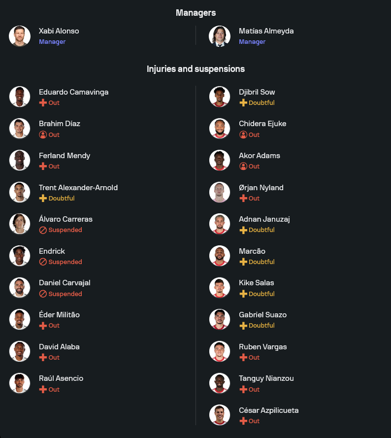 ปัญหาใหญ่ของเรอัล มาดริดคือบรรดาแข้งเดี้ยงยาวอย่าง เอแดร์ มิลิเตา, ดาวิด อลาบา, เอ็ดดูอาร์โด้ กามาวินก้า, แฟร์กล็องด์ เมนดี้ รวมถึง บราฮิม ดิอาซ ขณะที่ ดานิ การ์บาฆาล และดาวรุ่งอย่าง เอนดริก กับ อัลบาโร การ์เรราส ติดโทษแบน ทำให้ขุมกำลังแนวรับต้องปรับกันยกชุด