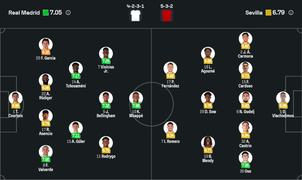ภาพไลน์อัพจากข้อมูลล่าสุดบอกชัดว่า ชาบี อลอนโซ่เดินหน้าใช้ระบบ 4-2-3-1 เป็นหลัก อาศัยพลังเกมรุกจากสตาร์ค่าตัวมหาศาลอย่าง คีลิยัน เอ็มบัปเป้, วินิซิอุส จูเนียร์, โรดรีโก้ และ จูด เบลลิงแฮม เป็นตัวทะลวงแนวรับเซบีย่า