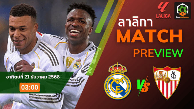คืนวันอาทิตย์ที่ 21 ธันวาคม 2568 เวลา 03.00 น. แฟนบอลทั่วโลกต้องห้ามกระพริบตา เมื่อสนามซานติอาโก เบร์นาเบวจะเปิดไฟสว่างจ้าต้อนรับการมาเยือนของเซบีย่า ศึกลา ลีกา สเปน ที่มีเดิมพันคือการลุ้นไล่จี้บาร์เซโลน่าบนหัวตารางเต็มตัว สำหรับใครที่เปิดดูโปรแกรมใน ตารางบอลวันนี้ จะเห็นชัดว่านี่คือคู่ใหญ่ประจำสัปดาห์อย่างแท้จริง เรอัล มาดริด ของชาบี อลอนโซ่ กำลังเดินหน้าคว้าชัยสองนัดติดและหวังเพิ่มเป็นสามเกมรวด ขณะที่เซบีย่าของ มาติอัส อัลเมย์ด้า ยืนอยู่กลางตารางแต่ยังมีลุ้นโซนยุโรป หากบุกมาสร้างเซอร์ไพรส์ได้สักแต้มในคืนแห่งความกดดันนี้