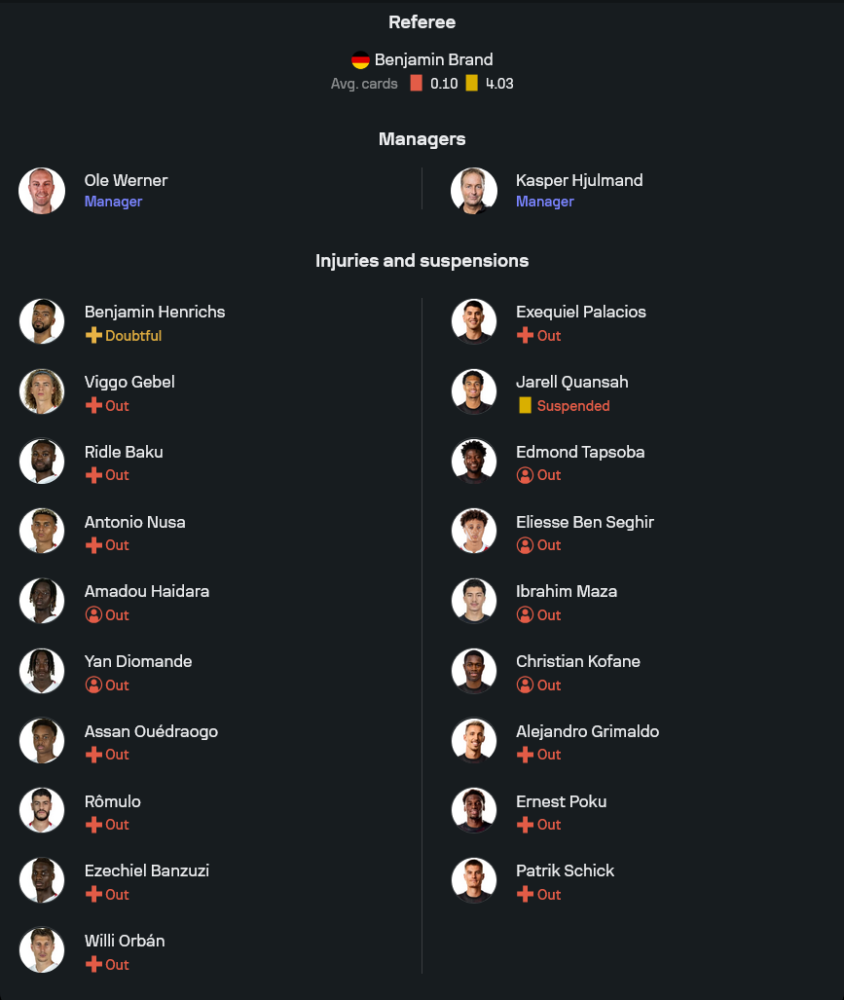 อย่างไรก็ตาม เลเวอร์คูเซินเสียหายพอตัวจากอาการบาดเจ็บและภารกิจทีมชาติ รายชื่อที่หายไปมีทั้ง เอ็ดม็องด์ ตัปโซบา, เอลิเอสเซ่ เบน เซกีร์, อิบราฮิม มาซา, คริสเตียน โคฟาเน่ในบางช่วงของสัปดาห์ซ้อม รวมถึงดาวยิงตัวเก๋าอย่าง ปาทริค ชิค ที่สภาพร่างกายยังไม่เต็มร้อย ขณะเดียวกันแนวรับอย่าง จาเรลล์ ควอนซาห์ ติดโทษแบนชวดลงแน่นอน ทำให้ฮยุลมันด์ต้องโรเตชันพอสมควรเพื่อให้ทีมยังยืนระยะได้ตลอด 90 นาที