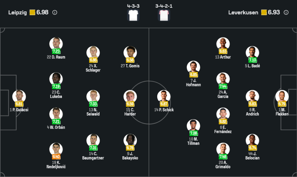โอเล่ แวร์เนอร์ นายใหญ่ไลป์ซิกยังคงพึ่งระบบ 4-3-3 ที่ทีมคุ้นเคยจากภาพไลน์อัพล่าสุด ปีเตอร์ กูลาชชี รับหน้าที่เฝ้าเสา แผงหลังสี่คนใช้ คอสต้า เนเดลจ์โควิช ยืนแบ็กขวา คู่เซ็นเตอร์เป็น วิลลี่ ออร์บาน จับคู่ กาสเตลโล ลูเกบา ส่วนฝั่งซ้ายมี ดาวิด เราม์ เติมเกมบุกจัดจ้าน