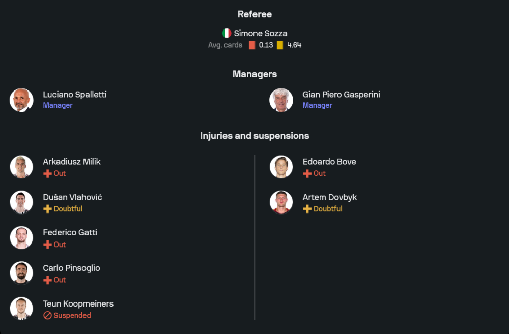 ปัญหาของยูเว่ยังคงเป็นเรื่องตัวเจ็บในแนวรุก อาร์คาดิอุสซ์ มิลิค และ ดูซาน วลาโฮวิช มีปัญหาร่างกายรบกวน โดยรายหลังยังต้องรอประเมินความฟิต ขณะเดียวกันแนวรับสำรองอย่าง เฟเดริโก้ กัตติ กับนายด่านเก๋า คาร์โล พินโซโญ ก็ยังเดี้ยง ส่วนห้องเครื่องคนสำคัญ เทิน คูปไมเนอร์ส ติดโทษแบน ทำให้แดนกลางต้องฝากความหวังไว้กับ ตูราม และ โลคาเตลลี่ เป็นหลัก