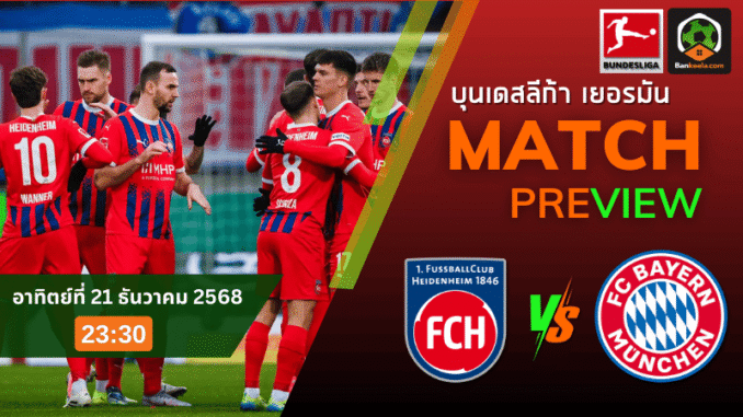 บุนเดสลีกา คืนวันอาทิตย์ที่ 21 ธันวาคม 2568 เวลา 23.30 น. ตามโปรแกรมใน ตารางบอลวันนี้ แฟนบอลจะได้ชมเกมที่โคตรน่าสนใจ ระหว่างไฮน์เดนเฮลม์ ทีมอันดับท้ายตาราง ที่พร้อมลุกเป็นไฟเมื่อได้เล่นในถิ่น วอยธ์ อารีน่า เมืองไฮเดนไฮม์ อัน แดร์ เบรนซ์ รับการมาเยือนของจ่าฝูง บาเยิร์น มิวนิค ยักษ์ใหญ่ที่ชื่อชั้นเหนือกว่าแทบทุกด้าน แต่ยังมีรอยแผลจากเกมล่าสุดที่สะดุดเจ๊าทีมบ๊วยแบบสุดเซ็ง เกมนี้จึงมีแรงกดดันมหาศาลทั้งในสนามและข้างสนาม สำหรับสายเชียร์ที่อยากลุ้นแบบภาพคมชัดเสียงแน่น บอกเลยว่าคู่นี้ต้องจัดจอ ดูบอลออนไลน์ เอาไว้ให้ดี เพราะเป็นเกมที่มีโอกาสไหลไปถึงสกอร์สูงเหมือนทุกครั้งที่เสือใต้ลงเล่น