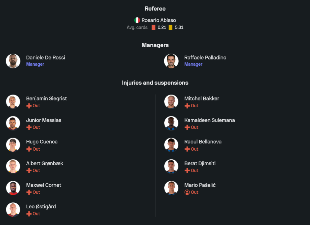 ฝั่งอตาลันต้าของ ราฟฟาเอเล่ ปัลลาดิโน่ สภาพทีมก็ไม่ต่างกันมาก มีแข้งเจ็บสะสมยาวเป็นหางว่าว ทั้งแนวรับอย่าง ราอูล เบลลาโนว่า, อดิลอน คอสซูนู และ เบรัต ดิมชิตี้ กลางสนามมี มิตเชล บัคเกอร์ เดี้ยงเพิ่ม ส่วนแนวรุกอดใช้งาน คามัลดีน ซูเลมาน่า และ อเดโมล่า ลุคแมน ที่ต้องไปช่วยชาติในศึกแอฟริกัน คัพ ออฟ เนชั่นส์ ถึงอย่างนั้นชื่อชั้นขุมกำลังที่เหลือก็ยังดูแน่น