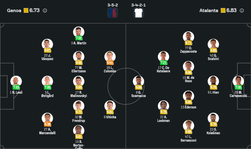 จากข้อมูลจัดตัวตามค่าคะแนนเฉลี่ยในภาพ เจนัวมาในระบบ 3-5-2 ใช้ นิโกล่า เลอาลี่ ยืนเฝ้าเสา แนวรับมี เลโอ ออสติการ์ด, โฆอัน บัสเกซ และ อเลสซานโดร มาร์กันดัลลี คุมหลังบ้าน ขณะที่อตาลันต้าออกสตาร์ทด้วยระบบ 3-4-2-1 นำโดย มาร์โก คาร์เนเซ็คคี่ ยืนด่านสุดท้าย มี จอร์โจ สคาลวินี่, เบรัต ฌิมซิตี้ และ เซอัด โคลาซินัค ขึงแนวรับ พร้อมแผงรุกตัวโหดอย่าง ชาร์ลส์ เดอ เคเตแลเร่, อเดโมล่า ลุคแมน และ จานลูก้า สคามัคก้า ให้กองเชียร์ได้ลุ้นทุกจังหวะยิง