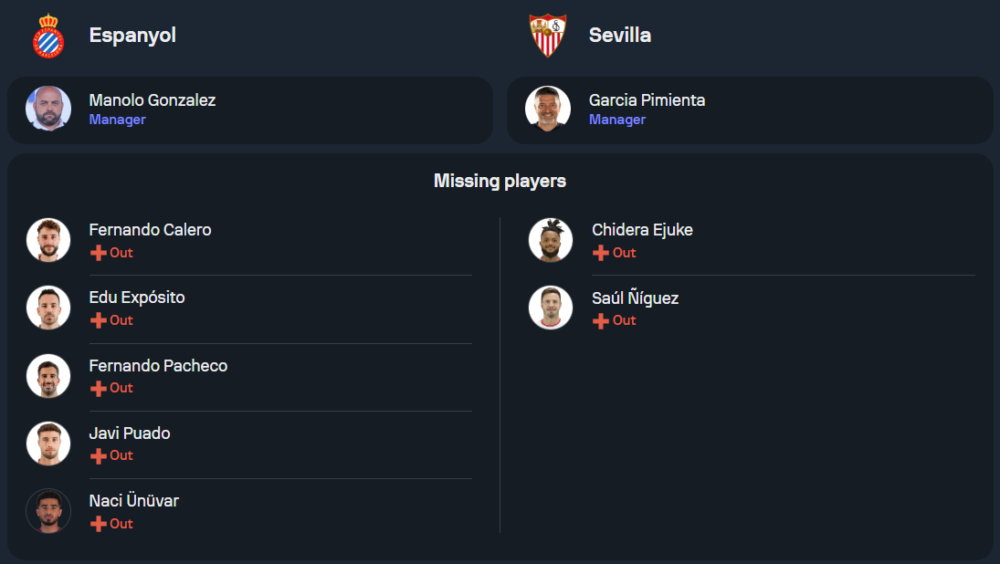 สำหรับฝั่งเจ้าบ้าน เอสปันญ่อล เกมนี้พวกเขายังต้องขาด เฟร์นานโด กาเลโร่ ปราการหลังที่มีอาการบาดเจ็บกล้ามเนื้อ ขณะที่สองตัวหลักอย่าง ฆาบี ปัวโด้ และ เอดู เอ็กซ์โปซิโต้ ต้องรอทดสอบความฟิตก่อนเกมจะเริ่ม แต่ทีมยังคงสามารถใช้ผู้เล่นหลักจากเกมล่าสุดได้อย่างครบถ้วน โดยจะลงสนามในระบบ 4-3-3 มี อัลบาโร่ เทเฆโร่, วาลิด เชดดิร่า และ คาร์ลอส โรเมโร่ เป็นสามประสานในเกมรุกเพื่อลุ้นทำประตู