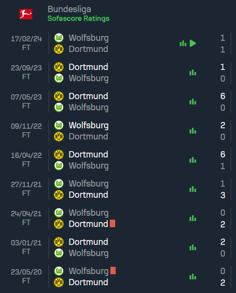 จากสถิติการพบกันในระยะหลัง โวล์ฟสบวร์กดูเป็นรองอย่างชัดเจน โดยใน 10 นัดหลังสุด พวกเขาเอาชนะดอร์ทมุนด์ได้เพียงแค่ 1 เกม เสมอ 1 และพ่ายแพ้ไปถึง 8 เกม ซึ่งแสดงให้เห็นว่าการเจอกับดอร์ทมุนด์เป็นงานที่ไม่ง่ายสำหรับโวล์ฟสบวร์ก โดยในเกมล่าสุดที่พบกันจบลงด้วยผลเสมอ 1-1 แม้จะสามารถยันเสมอได้ แต่โดยรวมยังถือว่าดอร์ทมุนด์เป็นฝ่ายที่เหนือกว่า