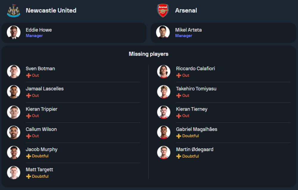 ภายใต้การคุมทัพของ เอ็ดดี้ ฮาว ทีมมีปัญหากับความฟิตของผู้เล่น โดยเฉพาะ อเล็กซานเดอร์ อิซัก หัวหอกที่ต้องรอลุ้นว่าจะพร้อมลงสนามหรือไม่หลังได้รับบาดเจ็บในเกมที่ชนะ เชลซี ในคาราบาวคัพ อีกทั้ง แอนโธนี่ กอร์ดอน และ เจค็อบ เมอร์ฟี่ ก็ยังคงมีปัญหาเจ็บ ส่วนตัวเจ็บก่อนหน้านี้ยังมี จามาล ลาสเซลส์, สเวน บ็อตแมน, คีแรน ทริปเปียร์ และ คัลลั่ม วิลสัน อย่างไรก็ตามทีมยังคงใช้ระบบ 4-3-3 โดยมี ฮาร์วี่ย์ บาร์นส์, อเล็กซานเดอร์ อิซัก และ แอนโธนี่ กอร์ดอน เป็นสามประสานเกมรุก