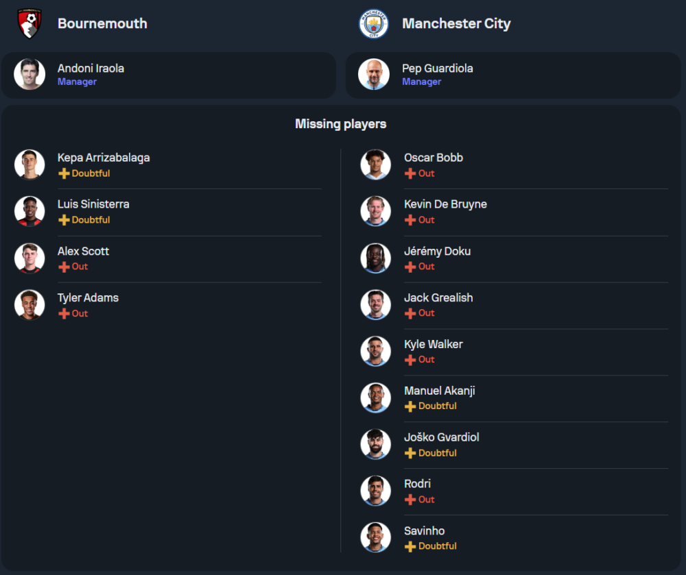 ด้านทีมเยือนของ เปป กวาร์ดิโอลา กำลังเผชิญสถานการณ์ที่ท้าทาย มีนักเตะซีเนียร์เหลือใช้งานเพียง 13 รายเท่านั้นหลังจากพ่าย ท็อตแน่ม ฮ็อทสเปอร์ และตกรอบ คาราบาวคัพ พร้อมกับเสีย มานูเอล อาคันจี และ ยอชโก้ กวาร์ดิโอล เพิ่มเติม ขณะที่ เควิน เดอ บรอยน์, ไคล์ วอล์คเกอร์, แจ็ค กรีลิช และ โรดรี้ เอร์นานเดซ มิดฟิลด์ตัวเก่งยังคงอยู่ในลิสต์บาดเจ็บ แต่ยังมีข่าวดีเมื่อ เอแดร์ซอน, มาเตโอ โควาชิช, แบร์นาโด้ ซิลวา และ เออร์ลิง ฮาลันด์ กลับมาฟิตพร้อมลงเล่นในระบบ 4-1-4-1 เพื่อเน้นเกมรุกเต็มที่