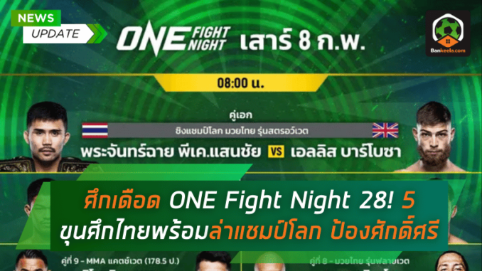 เตรียมพบกับความมันส์ระดับโลกในศึก ONE Fight Night 28 ที่จะจัดขึ้นอย่างยิ่งใหญ่ในวันเสาร์ที่ 8 กุมภาพันธ์ 2568 โดยในครั้งนี้เหล่าแฟนกีฬาการต่อสู้จะได้ตื่นตาตื่นใจกับขุนศึกไทยสุดแกร่งถึง 5 คน ที่จะยกพลขึ้นสังเวียนเพื่อปกป้องศักดิ์ศรีและโบกธงชาติไทยให้สะบัดกลางเวทีระดับโลก งานนี้รับประกันความดุเดือดเร้าใจถ่ายทอดสดจาก สนามมวยเวทีลุมพินี (รามอินทรา) ให้แฟนมวยได้ลุ้นระทึกตั้งแต่เวลา 08:00 น. ตามเวลาประเทศไทย