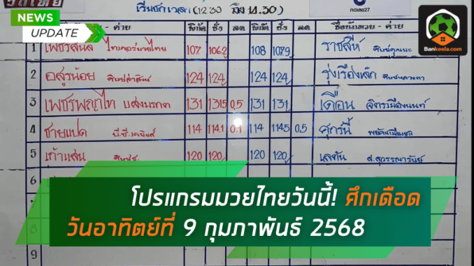 คอมวยไทยเตรียมมันส์! โปรแกรมมวยไทยวันนี้ วันอาทิตย์ที่ 9 กุมภาพันธ์ 2568 จัดเต็มความดุเดือดจากหลากหลายเวทีดัง ไม่ว่าจะเป็น มวยไทย 7 สี, ศึก ONE ลุมพินี, ศึกจ้าวมวยไทย ช่อง 3, ศึก RWS ราชดำเนิน เวิลด์ซีรีส์, มวยมันส์วันศุกร์, และ ศึกเพชรยินดี พร้อม ลิงก์ดูมวยสด ให้แฟนมวยติดตามแบบไม่มีพลาด!