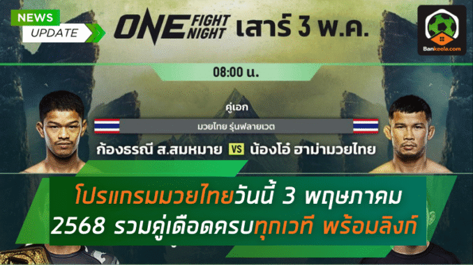 คอมวยเตรียมลุกฮือ! วันเสาร์ที่ 3 พฤษภาคม 2568 นี้คืออีกหนึ่งวันสำคัญที่แฟนพันธุ์แท้ ดูมวยไทย ไม่ควรพลาด เพราะศึกเดือดจากทุกเวทีทั่วประเทศต่างพร้อมใจกันจัดเต็มบนสังเวียน ทั้งรายการระดับโลกอย่าง ONE ลุมพินี, ศึกจ้าวมวยไทย, RWS ราชดำเนิน เวิลด์ซีรีส์, ไทยไฟต์, ศึกพีพีทีวี เกียรติเพชร และอีกมากมาย ใครที่อยากลุ้นทุกหมัดแบบสด ๆ สามารถรับชมผ่านลิงก์ ดูมวยสด จาก BANKEELA ได้ครบทุกช่องทาง