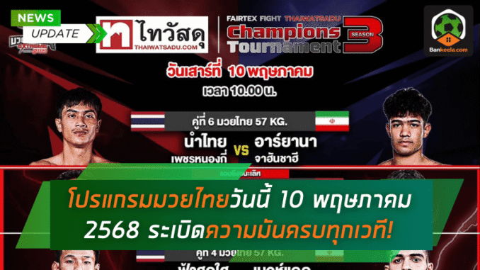 วันเสาร์นี้แฟน ดูมวยไทย ห้ามพลาดแม้แต่รายการเดียว เพราะทุกคู่คือความมันระดับพรีเมียม ที่พร้อมจุดไฟศึกบนเวทีจากเหนือจรดใต้ ชมกันสดๆ ได้ทุกเวทีผ่านลิงก์ของ BANKEELA ที่คัดมาให้คุณแล้วแบบครบเครื่อง