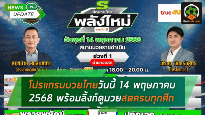 โปรแกรมมวยไทยวันนี้ 14 พฤษภาคม 2568 พร้อมลิ้งก์ดูมวยสดครบทุกศึกเด็ด! ชวนแฟนมวยมันสะเทือนจอ