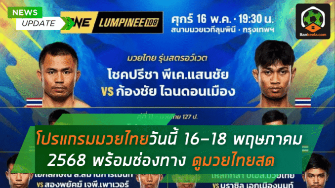 แฟนมวยไม่ควรพลาด! สุดสัปดาห์นี้ โปรแกรมมวยไทยวันนี้ ตั้งแต่วันศุกร์ที่ 16 จนถึงวันอาทิตย์ที่ 18 พฤษภาคม 2568 จัดเต็มด้วยศึกดังจากทุกเวที ไม่ว่าจะเป็น ONE ลุมพินี, RWS ราชดำเนิน เวิลด์ ซีรีส์, มวยไทย 7 สี, ศึกจ้าวมวยไทย, LWC Super Champ, ไทยไฟท์, Fairtex Fight, ไปจนถึง ศึกท่อน้ำไทย เกียรติเพชร ทีเคโอ โดยมีลิงก์ถ่ายทอดสดให้ชมแบบชัดเจนผ่านช่องทางจาก BANKEELA และแพลตฟอร์มหลัก เช่น YouTube และสถานีโทรทัศน์ต่าง ๆ