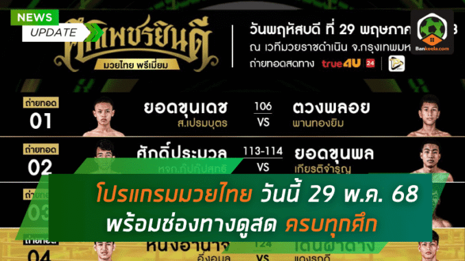 ศึกเดือดทั่วสังเวียน! โปรแกรมมวยไทยวันนี้ 29 พ.ค. 68 พร้อมช่องทางดูสดครบทุกศึก