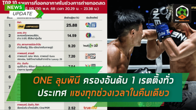 และนี่ไม่ใช่ครั้งแรกที่ ONE ลุมพินี ทะลวงเพดานเรตติ้งจนขึ้นนำแบบเบ็ดเสร็จ เพราะตลอดระยะเวลากว่า 2 ปีครึ่งที่ผ่านมา รายการนี้แสดงให้เห็นถึงความแข็งแกร่งอย่างต่อเนื่อง ครองความนิยมสูงสุดแบบไม่ตกกราฟ ไม่ว่าจะเทียบกับรายการประเภทกีฬา บันเทิง วาไรตี้ หรือแม้แต่ข่าวสารช่วงไพรม์ไทม์ที่ว่าแน่นแค่ไหนก็ยังต้องถอยให้