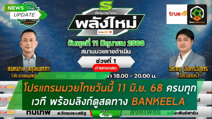 ใครที่เฝ้ารอความเดือดบนสังเวียนหมัดแบบไทยแท้ วันนี้ถึงเวลาที่แฟนๆ ดูมวยไทย จะได้เต็มอิ่มกับศึกกำปั้นแบบไม่มีพัก! โปรแกรมมวยไทยวันนี้ วันพุธที่ 11 มิถุนายน 2568 จัดหนักจัดเต็มทั้งศึกเวทีดัง ศึกมวยเงินล้าน และนักมวยฟอร์มฮอตจากทั่วสารทิศ มารวมตัวกันในค่ำคืนนี้เพื่อวัดฝีมือกันอย่างสุดเดือด บ้านกีฬา ขอพาไปไล่เรียงกันทีละเวที พร้อมแนบลิงก์ ดูมวยสด ผ่านช่องทางคุณภาพจาก BANKEELA ให้คุณไม่พลาดทุกคู่เด็ดจากทุกสนาม