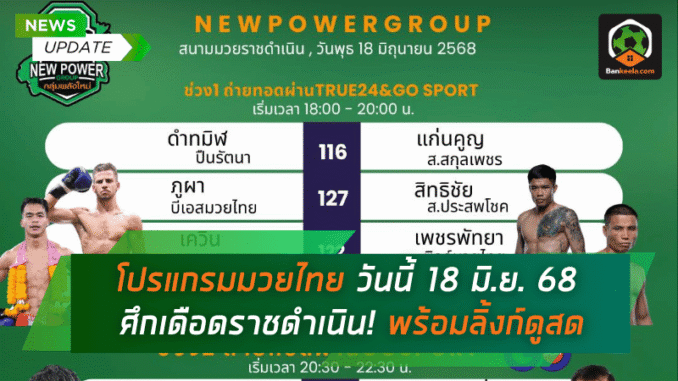 ศุกร์นี้อย่าได้กระพริบตา! เพราะเวทีราชดำเนินเตรียมเปิดศึกไฟต์เดือดให้แฟนมวยทั่วประเทศได้ลุ้นกันแบบชิดติดขอบจอ กับ โปรแกรมมวยไทยวันนี้ วันพุธที่ 18 มิถุนายน 2568 ที่อัดแน่นไปด้วยคู่มวยคุณภาพจากศึกดัง “มวยไทยพลังใหม่” ที่เวทีมวยราชดำเนิน พร้อมการถ่ายทอดสดแบบเรียลไทม์ทั้งทางทีวีและออนไลน์ผ่าน BANKEELA ที่เดียวครบจบสำหรับคอมวยไทยตัวจริง
