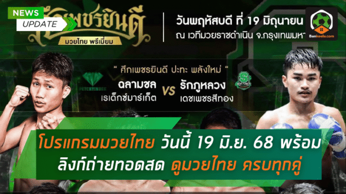 แฟนมวยเตรียมมันกันให้พร้อม! โปรแกรมมวยไทยวันนี้ วันพฤหัสบดีที่ 19 มิถุนายน 2568 อัดแน่นด้วยไฟต์เดือดจากศึกดังทั่วประเทศ โดยเฉพาะศึกใหญ่ เพชรยินดี ที่ระเบิดความมันบนเวทีราชดำเนินแบบเต็มคาราเบล แบ่งออกเป็น 2 ช่วง ถ่ายทอดสดครบทั้งทาง True4U และ PRYDE TV ส่วนใครอยาก ดูมวยไทย ออนไลน์แบบคมชัด ไม่พลาดแม้แต่วินาทีเดียว คลิกดูสดผ่าน BANKEELA ได้ทันที