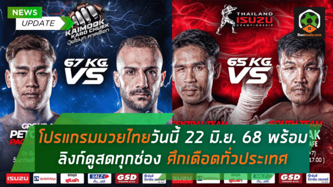 คอมวยไทยห้ามพลาด! วันอาทิตย์ที่ 22 มิถุนายน 2568 มาถึงแล้วพร้อมกับศึกกำปั้นเดือดทั่วฟ้าเมืองไทยที่เรียงคิวมาสร้างความมันส์แบบไม่มีพัก ทั้ง มวยไทย 7 สี, ศึกไทยไฟท์, ศึกมวยดีวิถีไทย, RWS ราชดำเนินเวิลด์ซีรีส์, และ ศึกท่อน้ำไทย เกียรติเพชร TKO เรียกได้ว่าขึ้นเวทีครบทุกแนว ทุกสไตล์ ตั้งแต่รุ่นเล็กยันรุ่นใหญ่ และแน่นอนว่าสาวกสายมวยสามารถกดรับชม ดูมวยไทย แบบสดๆ ครบทุกคู่ผ่านลิงก์จาก BANKEELA ที่เรารวบรวมมาให้ในบทความนี้เรียบร้อย!