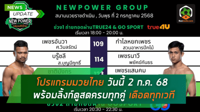 เข้าสู่วันพุธที่ 2 กรกฎาคม 2568 เหล่าคอมวยไม่ควรพลาดเด็ดขาด เพราะวันนี้วงการมวยไทยจัดเต็มทุกศึกใหญ่ให้แฟนๆ ได้ระเบิดอารมณ์กันแบบจัดหนัก โดยเฉพาะศึกบนเวทีราชดำเนินที่ขนมาทั้ง ศึกมวยไทยพลังใหม่ ในสองช่วงเวลา พร้อมบู๊กันตั้งแต่หัวค่ำยาวถึงค่ำคืน แถมมีลิ้งก์ ดูมวยไทย สดครบถ้วนให้รับชมกันฟรีๆ ทาง True4U และ เว็บไซต์ BANKEELA ที่เตรียมยิงสดผ่าน GOSPORT แบบไม่ให้พลาดสักวินาที!