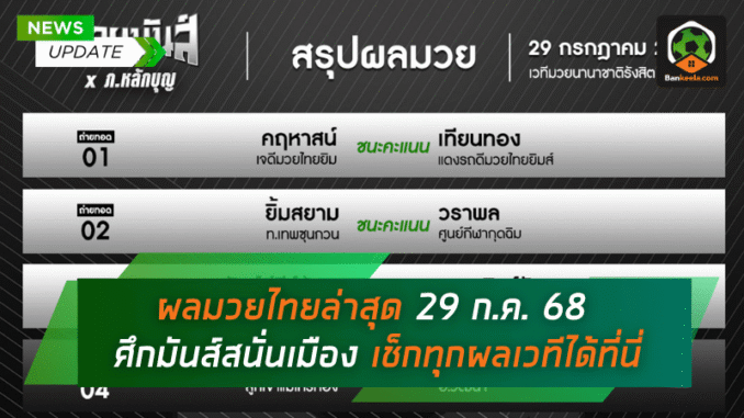 📌 ผลมวยไทย วันอังคารที่ 29 กรกฎาคม 2568 รายการ “ศึกมวยมันส์สนั่นเมือง X ภ.หลักบุญ”