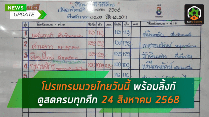 สายกำปั้นเตรียมตัวให้พร้อม เพราะ โปรแกรมมวยไทยวันนี้ วันอาทิตย์ที่ 24 สิงหาคม 2568 จัดหนักเต็มพิกัด ครบทุกสังเวียนใหญ่ ไม่ว่าจะเป็น มวยไทย 7 สี, ศึก ONE ลุมพินี, ศึกจ้าวมวยไทย ช่อง 3, ศึก RWS ราชดำเนิน เวิลด์ซีรีส์, ไทยไฟท์ และ ศึกเพชรยินดี ใครเป็นแฟนพันธุ์แท้บอกเลยว่าห้ามกระพริบตา เพราะทุกคู่คือการันตีไฟต์ดุเดือด และสามารถกดเข้าไป ดูมวยไทย แบบสดๆ ได้ผ่าน BANKEELA ที่นี่