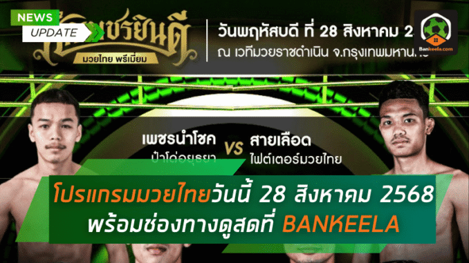 บ้านกีฬา ขอนำเสนอแฟนๆ คอมวยกับ โปรแกรมมวยไทยวันนี้ วันพฤหัสบดีที่ 28 สิงหาคม 2568 ที่อัดแน่นไปด้วยศึกเดือดจากหลากหลายเวทีชั้นนำของประเทศ ใครที่ชื่นชอบการติดตาม ผลมวยไทย ห้ามพลาดเด็ดขาด เพราะคืนนี้มีทั้งศึกเพชรยินดี, ศึก ONE ลุมพินี, ศึกจ้าวมวยไทย ช่อง 3, ศึก RWS ราชดำเนิน เวิลด์ซีรีส์ รวมไปถึง ไทยไฟท์ เรียกได้ว่าครบทุกอารมณ์ของแฟนมวยไทย พร้อมลิงก์ ดูมวยไทยสด ผ่าน BANKEELA ให้กดติดตามได้สะดวกทันใจ