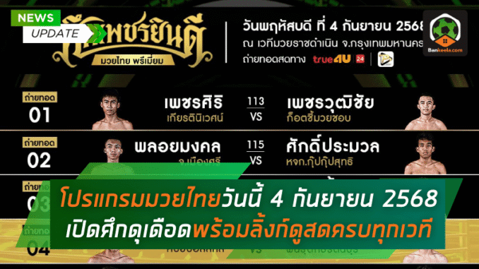สำหรับคอมวยไทย วันนี้ บ้านกีฬา ขนข้อมูลจัดเต็ม โปรแกรมการแข่งขัน มวยไทย วันพฤหัสบดีที่ 4 กันยายน 2568 มาพร้อมตารางคู่มวยเดือดที่แฟนมวยห้ามพลาด ครบทั้ง ศึกเพชรยินดี, ศึก ONE ลุมพินี, ศึกจ้าวมวยไทย ช่อง 3, ศึก RWS ราชดำเนิน เวิลด์ซีรีส์ รวมถึงไทยไฟท์ และ มวยไทย 7 สี นอกจากนี้ยังแนบช่องทาง ดูมวยไทย ผ่านลิ้งก์สดและแอปพลิเคชันให้พร้อมสรรพ ใครที่อยากติดตาม ผลมวยไทย แบบเรียลไทม์ก็จัดให้เต็มที่