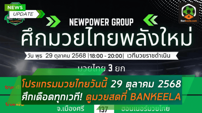 คืนวันที่ 29 ตุลาคม 2568 ถือเป็นอีกหนึ่งวันของคนรักมวยไทย เพราะทุกศึกจัดเต็มตั้งแต่หัวค่ำยันดึก ไม่ว่าจะสายเดิมพันหรือสายเชียร์ รับรองได้ลุ้นกันทุกคู่ หากใครอยากติดตาม ดูมวยไทยสด หรือเช็ก ผลมวยไทย แบบเรียลไทม์ อย่าลืมคลิกเข้า BANKEELA และติดตามข่าววงการมวยต่อเนื่องได้ที่ มวยสดบ้านกีฬา เว็บไซต์สายกีฬาที่อัปเดตเร็วที่สุดในไทย