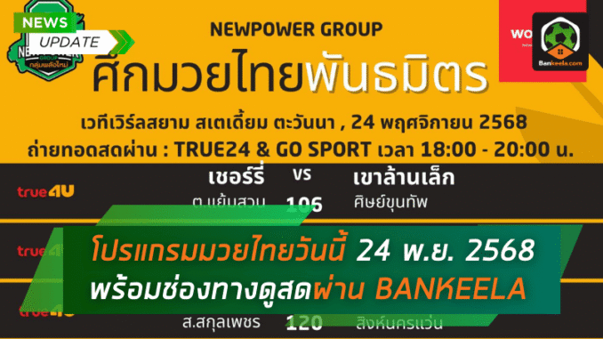 สำหรับโปรแกรมวันนี้ วันจันทร์ที่ 24 พฤศจิกายน 2568 เปิดหัวด้วยรายการ “มวยไทยพันธมิตร” ณ เวทีมวยเวิลด์สยาม สเตเดี้ยม ตะวันนา บางกะปิ ช่วงแรกเริ่มเวลา 18.00 น. ถ่ายทอดสดผ่าน True4U และสามารถรับชมออนไลน์ผ่าน BANKEELA ที่รองรับทั้งมือถือและสมาร์ททีวี เหมาะอย่างยิ่งสำหรับคนที่ต้องการความเสถียรและความคมชัดระดับสูง