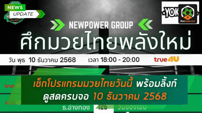 วันนี้แฟนกำปั้นมีนัดใหญ่ เพราะ โปรแกรมมวยไทยวันนี้ วันพุธที่ 10 ธันวาคม 2568 อัดแน่นไปด้วยศึกดังจากหลากหลายเวที ทั้ง มวยไทย 7 สี, ศึก ONE ลุมพินี, ศึกจ้าวมวยไทย ช่อง 3, ศึก RWS ราชดำเนิน เวิลด์ซีรีส์, ไทยไฟท์ และศึกเพชรยินดี แต่ไฮไลต์สำคัญที่คอมวยจับตามองเป็นพิเศษ คือศึกมวยไทยพลังใหม่จากเวทีราชดำเนิน ที่นอกจากจะได้บรรยากาศคลาสสิกของสนามมวยเก่าแก่แล้ว ยังได้ดูมวยชั้นดีปะทะกันแบบเต็มอัตราศึก เหมาะสำหรับแฟนที่อยากนั่งหน้าจอเช็กทั้งฟอร์มมวยและ ผลมวยไทย ไปพร้อมกัน