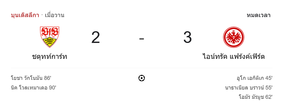 การแข่งขัน บุนเดสลีกา ในวันนี้เป็นอีกหนึ่งเกมที่น่าตื่นเต้นและคาดไม่ถึงสำหรับแฟนบอลทั้งสองทีม ผลสุดท้ายเป็นฝั่งของ ไอน์ทรัค แฟร้งค์เฟิร์ต ที่สามารถบุกมาคว้าชัยชนะไปได้ด้วยสกอร์ 3-2 ท่ามกลางการบุกที่หนักหน่วงจากเจ้าบ้าน สตุ๊ตการ์ต