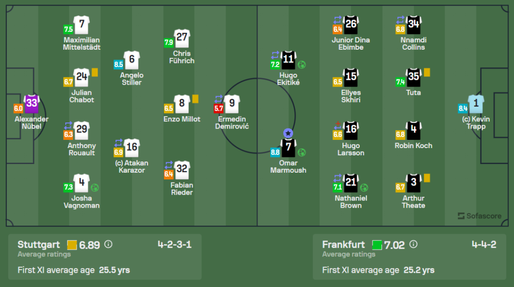 - โอกาสยิง: สตุ๊ตการ์ต 22 ครั้ง – 8 ครั้ง แฟร้งค์เฟิร์ต