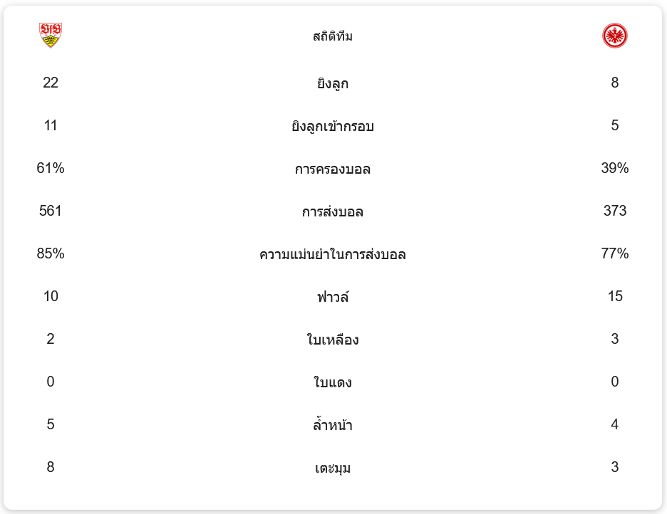 - ลูกเตะมุม: สตุ๊ตการ์ต 8 ครั้ง – 3 ครั้ง แฟร้งค์เฟิร์ต