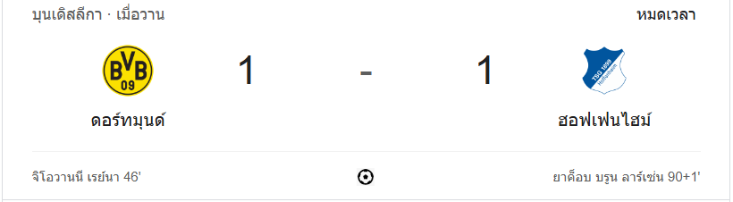 บ้านกีฬา พาแฟนบอลมาติดตาม ผลบอลสด ศึกบุนเดสลีกา เยอรมนี นัดที่ดุเดือดระหว่าง โบรุสเซีย ดอร์ทมุนด์ เปิดบ้านรับการมาเยือนของ ทีเอสจี ฮอฟเฟนไฮม์ ซึ่งเกมนี้เต็มไปด้วยความเข้มข้น และช่วงท้ายเกมมีดราม่าตีเสมอจากทีมเยือน ส่งผลให้จบเกมด้วยสกอร์ 1-1 แบ่งแต้มกันไป