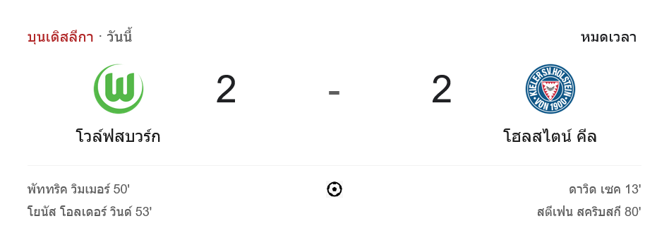 ศึก บุนเดสลีกา 2024 เกมที่น่าจับตามองระหว่าง โวล์ฟสบวร์ก และ โฮลสไตน์ คีล จบลงด้วยผล 2-2 อย่างสุดมัน เจ้าถิ่นไล่ตามตีเสมอได้สำเร็จหลังจากถูกนำก่อนในครึ่งแรกจาก ดาวิด เซช นาทีที่ 13 แต่พวกเขากลับมาได้ในครึ่งหลังจากการยิงของ แพทริค วิมเมอร์ นาทีที่ 50 และ โยนัส วินด์ นาทีที่ 53 ก่อนที่ สตีเว่น สคริบสกี้ จะมาตีเสมอให้ทีมเยือนในช่วงท้ายเกม นาทีที่ 80 แบ่งแต้มกันไปในเกมที่เต็มไปด้วยความเข้มข้น
